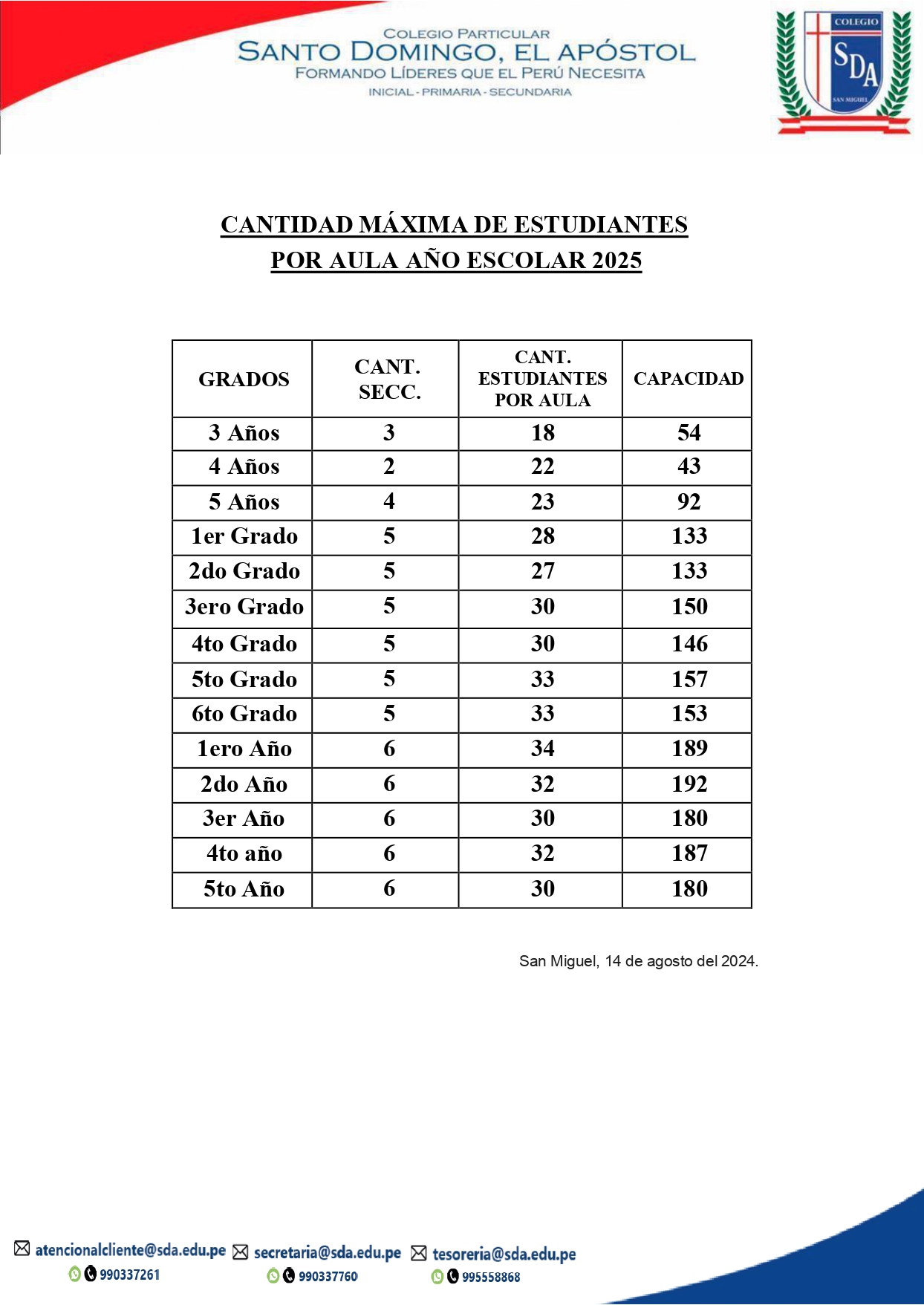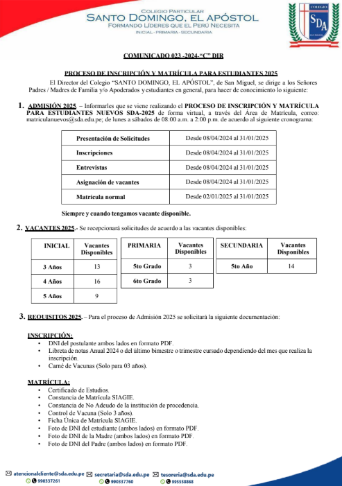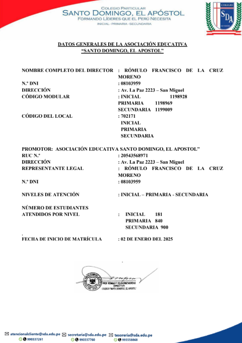 LISTA DE DOCUMENTOS OFICIALES 2025 Organigrama institucional REGLAMENTO INSTITUCIONAL 2025 PCI SDA 2025 PEI SDA 2025-2029 CANTIDAD MAXIMA DE ALUMNOS POR AULA-2025 COMUNICADO Nº 023-2024-C-SDA-DIR AUTORIZACIÓN DE APERTURA Y FUNCIONAMIENTO RÉCORD DE PENSIONES 2025 NORMAS DE CONVIVENCIA DOMINGUINA DATOS GENERALES DE LA INSTITUCIÓN CALENDARIZACIÓN 2025