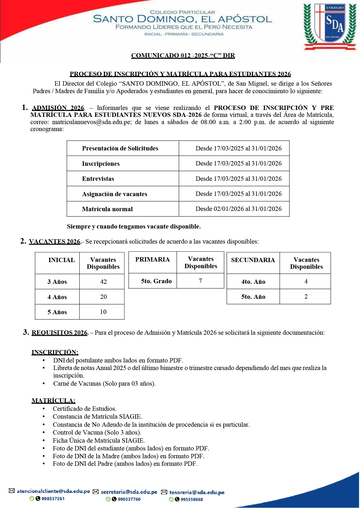 COMUNICADO Nº 012-2025-C-SDA-DIR